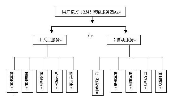 當(dāng)來(lái)話者撥通"12345"電話時(shí),聲訊臺(tái)自動(dòng)播放歡迎語(yǔ)"***政府熱線為您服務(wù),選擇人工服務(wù)請(qǐng)按1,自動(dòng)服務(wù)請(qǐng)按2"。