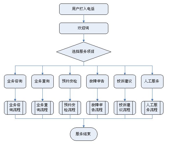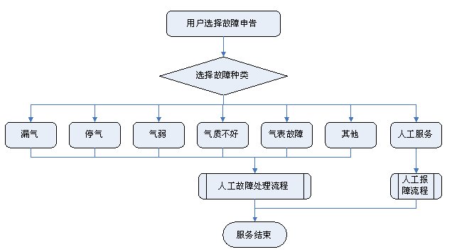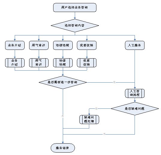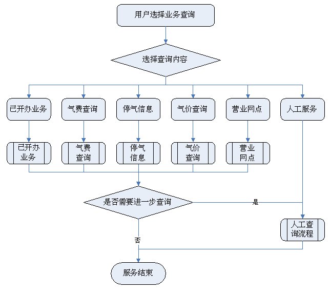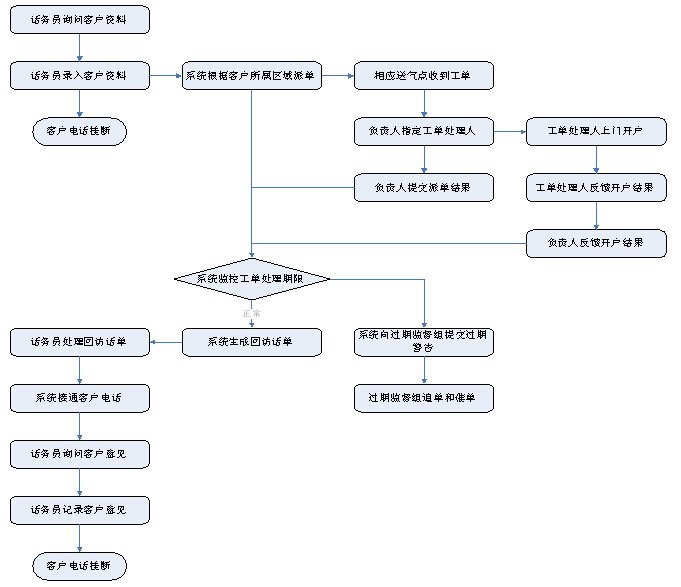 1)業(yè)務(wù)咨詢:用戶通過人工、自動語音等方式咨詢有關(guān)政策法規(guī)、資費(fèi)標(biāo)準(zhǔn)、用氣常識、報(bào)裝方法等,系統(tǒng)以語音、傳真、Email、短消息等方式回復(fù)客戶。