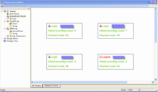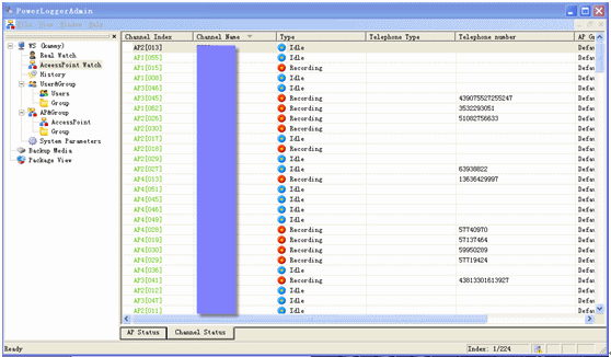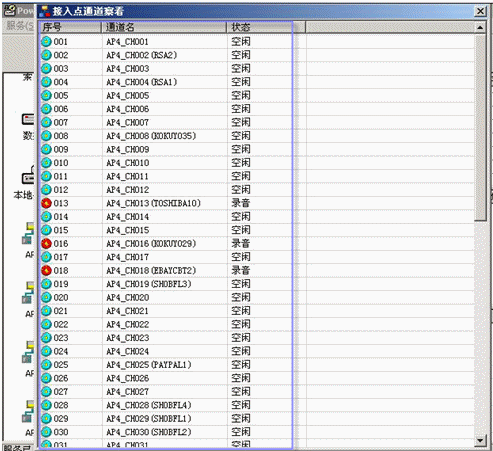 管理員通過管理員程序,遠(yuǎn)程登錄到中心點(diǎn)錄音服務(wù)器實(shí)時(shí)查看各個(gè)接入點(diǎn)的總體以及各個(gè)錄音通道的狀態(tài)