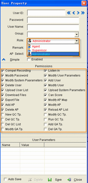 此用戶隸屬于管理員級(jí)別,但只能管理本組用戶,對(duì)于渣打銀行來說:只能查看所在支行(或者分行)的錄音歷史紀(jì)錄;查看所在支行(或者分行)的AP服務(wù)器狀態(tài);更新所在支行(或者分行)的AP服務(wù)器的系統(tǒng)參數(shù);立即同步所在支行(或者分行)的錄音歷史紀(jì)錄。