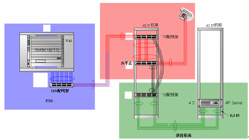 為了實(shí)現(xiàn)錄音的全面控制,不受被錄音人員的干擾,在渣打銀行錄音系統(tǒng)項(xiàng)目中采用在機(jī)房配線架端物理并線,使用硬件語(yǔ)音板卡采集電話錄音,如下圖所示: