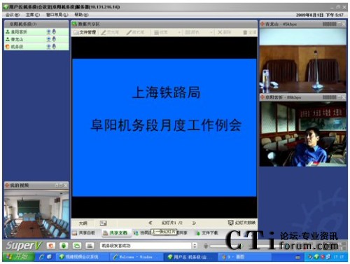 CTI論壇(ctiforum)08月06日消息: 日前,京九干線主力機(jī)務(wù)段——上海鐵路局阜陽機(jī)務(wù)段成功啟動(dòng)視維Super-V視頻會(huì)議系統(tǒng)。阜陽機(jī)務(wù)段的領(lǐng)導(dǎo)和職工,每天早上8點(diǎn)上班后,第一件事情就是登陸視頻會(huì)議系統(tǒng),匯報(bào)前日工作情況、部署當(dāng)日工作內(nèi)容。已然,山大聯(lián)潤(rùn)為上海路局阜陽機(jī)務(wù)段部署的阜陽機(jī)務(wù)段視頻會(huì)議系統(tǒng),成為鐵路部門必不可少的遠(yuǎn)程溝通交流工具,在有效提高鐵路系統(tǒng)溝通效率的同時(shí),保障了鐵路運(yùn)輸?shù)陌踩,極大滿足了鐵路部門暑期運(yùn)營(yíng)業(yè)務(wù)對(duì)溝通和會(huì)議的需求。
