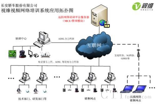 長安轎車大規(guī)模網(wǎng)絡(luò)遠(yuǎn)程會議和培訓(xùn)系統(tǒng)由服務(wù)器端和客戶端組成,服務(wù)器端軟件部署在重慶中心機(jī)房,中心機(jī)房配置1臺單獨(dú)服務(wù)器,支持400個客戶端同時在線,負(fù)責(zé)所有會議和培訓(xùn)的召集、音視頻交互、加密等工作,長安轎車各部門、轄下各零售點(diǎn)通過WEB方式(包括ADSL、3G無線等多種網(wǎng)絡(luò))即可實(shí)現(xiàn)客戶端軟件的自動安裝與升級,配備簡單的攝像頭和話筒之后就可以實(shí)現(xiàn)長安轎車以及400多零售點(diǎn)的大規(guī)模工作會議和高清音視頻網(wǎng)絡(luò)培訓(xùn)。網(wǎng)絡(luò)拓?fù)鋱D如下:
