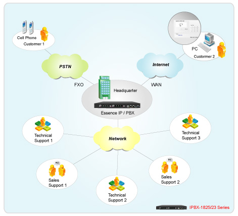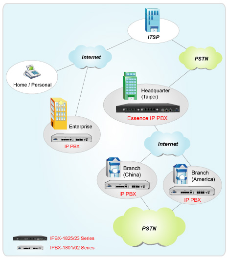 Essence IPBX系列可以注冊(cè)者之形式注冊(cè)于其他SIP協(xié)定伺服器上,如ITSP運(yùn)營平臺(tái),或是分公司之小型IP PBX注冊(cè)至總公司之大型IP PBX ,均可透過Internet 將話務(wù)無限延伸。