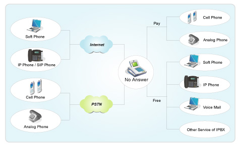 Essence IP-PBX的所有用戶均可透過內(nèi)部撥號(hào)方式之設(shè)定( Dialing Plan)將話務(wù)在不改變撥號(hào)習(xí)慣之前提下,經(jīng)由Internet導(dǎo)向外部ITSP服務(wù)商,再連接PSTN電話。