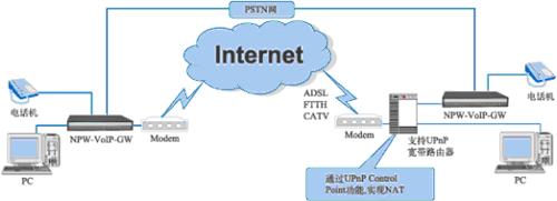 NPW-VoIP-GW作為客戶(hù)端VoIP網(wǎng)關(guān)置于各個(gè)企業(yè)分支機(jī)構(gòu)或家庭用戶(hù)桌面。其WAN接口可以連接各類(lèi)同步modem以PPP方式或使用以太網(wǎng)口接入公網(wǎng)。同時(shí)NPW-VoIP-GW上的FXO接口可以連接PBX接入PSTN網(wǎng)絡(luò)實(shí)現(xiàn)備份功能。如圖所示NPW-VoIP-GW上連接的話(huà)機(jī)可以直接通過(guò)Internet或PSTN撥打?qū)Ψ健?br />