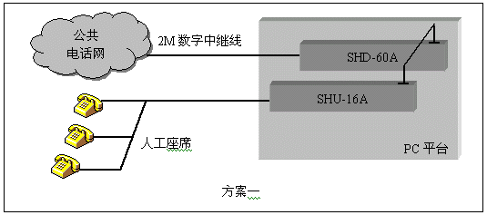 通道數(shù)較多的大中型應(yīng)用系統(tǒng),一般采用數(shù)字中繼線(E1)接入公共電話網(wǎng),三匯公司的SHD系列數(shù)字中繼卡可以提供相應(yīng)的解決方案。SHD系列數(shù)字中繼在一塊卡上集成了E1線接口,語音資源,信令處理等所必須的全部功能,其接入信令處理模塊可處理中國1號信令(SS1),7號信令(SS7),ISDN PRI協(xié)議(DSS1),單塊卡最多可支持4個E1接入。通過CT-BUS(或ST-BUS)總線,還可以在數(shù)字中繼線上實現(xiàn)傳真功能。典型應(yīng)用結(jié)構(gòu)如下圖: