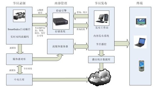 節(jié)目制作平臺主要負(fù)責(zé)節(jié)目的采編,接收節(jié)目源的數(shù)字視頻信號和模擬視頻信號進(jìn)行實(shí)時(shí)/超實(shí)時(shí)的轉(zhuǎn)碼,并同時(shí)進(jìn)行自動編目、歸檔,滿足系統(tǒng)不同應(yīng)用的要求。另外,各資源建設(shè)成員單位或各地、州、市遠(yuǎn)程辦按照省遠(yuǎn)程辦的統(tǒng)一部署,加工各自類別的課件,采用人工傳送介質(zhì)或利用VPN實(shí)現(xiàn)專網(wǎng)的方式送交到資源庫系統(tǒng)中,實(shí)施統(tǒng)一的存儲和管理。