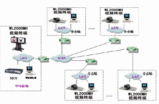 各個(gè)節(jié)點(diǎn)上的會(huì)議室型WL-2000MH終端的數(shù)據(jù)流可向多點(diǎn)控制器MCU發(fā)送動(dòng)態(tài)高清晰度圖像(720*576的FULL D1), 可以把主會(huì)場攝象機(jī)畫面清晰地傳輸?shù)剿蠾L-2000MH終端。
