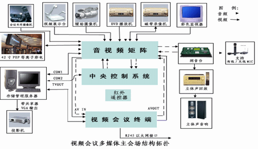 根據(jù)貴單位的分布特點(diǎn),視頻會(huì)議會(huì)議系統(tǒng)建立7個(gè)會(huì)場,其中主會(huì)場一個(gè),設(shè)在大樓的會(huì)議室,分會(huì)場6個(gè),設(shè)在各下屬單位會(huì)議室。傳輸信道采用系統(tǒng)內(nèi)部的寬帶IP綜合網(wǎng)絡(luò)。