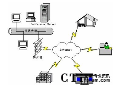 視頻會議服務(wù)器設(shè)置在上?偛浚ㄟ^電信的6M帶寬接入互聯(lián)網(wǎng),并配備有廣域網(wǎng)靜態(tài)IP地址。下屬生產(chǎn)基地和分支機構(gòu)通過電信ADSL接入和光纖接入等方式接入互聯(lián)網(wǎng)。這些點能夠?qū)崿F(xiàn)網(wǎng)絡(luò)視頻會議通訊,進行音頻、視頻和數(shù)據(jù)的多方溝通。