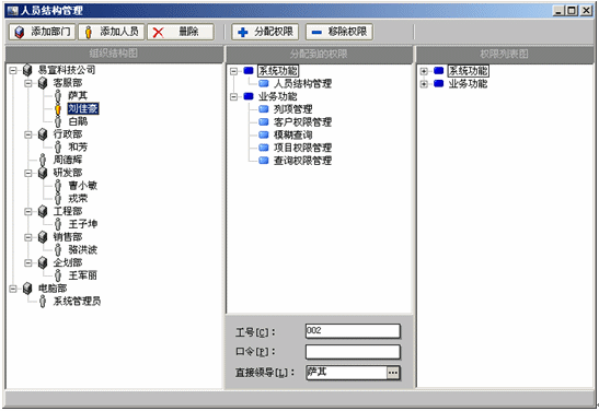 在這一模塊,管理員可以自由設(shè)置人員結(jié)構(gòu)、系統(tǒng)權(quán)限、客戶權(quán)限、查詢權(quán)限等;可以根據(jù)業(yè)務(wù)的需求在數(shù)據(jù)字典里自行添加報表或字段,并且設(shè)定業(yè)務(wù)表之間的關(guān)聯(lián)性;還可進行工作流的設(shè)定與分配,等等。