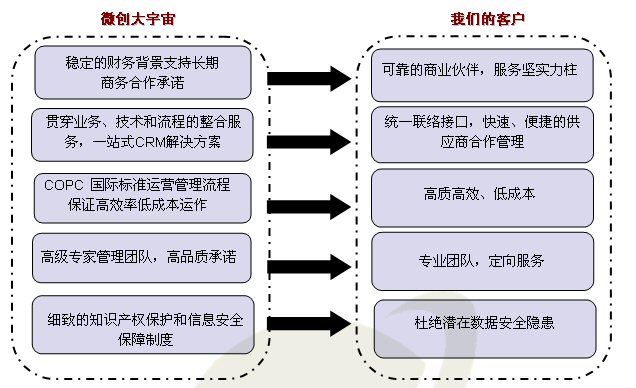 Wicresoft 微創(chuàng)軟件是上海聯(lián)和投資有限公司控股的國(guó)家重點(diǎn)軟件企業(yè),是微軟公司在華最重要的投資項(xiàng)目之一。自2002年5月成立以來(lái),本著“迅捷、誠(chéng)信、盡責(zé),打造值得信賴的國(guó)際化IT外包與服務(wù)提供商”的愿景,微創(chuàng)一直專注于信息技術(shù)外包(ITO)和業(yè)務(wù)流程外包(BPO)領(lǐng)域,不斷積累豐富的先進(jìn)技術(shù)、細(xì)致高效的流程管理、靈活調(diào)配的規(guī);瘜I(yè)人員,旨在為客戶提供度身定制的高績(jī)效專業(yè)服務(wù),打造完美客戶體驗(yàn)。