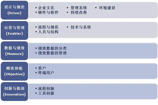 呼叫中心能力成熟度認(rèn)證涉及設(shè)計(jì)與規(guī)范、運(yùn)營(yíng)與管理、數(shù)據(jù)與績(jī)效、顧客體驗(yàn)、創(chuàng)新與提高5大類,14項(xiàng)評(píng)審指標(biāo)以及若干個(gè)值得關(guān)注的管理項(xiàng)目。是一套完整的“客戶為中心”的績(jī)效管理工具。