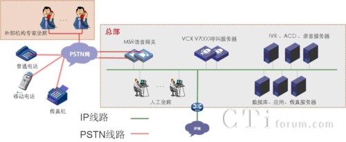 設備介紹:H3C VCX V7005完成呼叫處理;結合網(wǎng)音中間件軟件完成自動語音應答、人工智能排隊、錄音、話務統(tǒng)計輸出等功能;MSR語音網(wǎng)關完成PSTN落地功能。