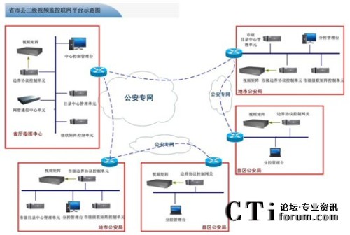 在省廳到地市之間配置視頻監(jiān)控聯(lián)網(wǎng)平臺中的核心管理調(diào)度單元、專用視頻終端、CS中心GIS控制客戶終端、邊界標(biāo)準(zhǔn)協(xié)議控制單元,地市核心管理調(diào)度單元、級聯(lián)矩陣控制中心單元、網(wǎng)管通信中心單元、中心音頻ACU調(diào)度單元、邊界標(biāo)準(zhǔn)協(xié)議控制網(wǎng)關(guān)、CS中心GIS控制客戶終端、通用型數(shù)字矩陣解碼陣列、通用標(biāo)準(zhǔn)控制矩陣鍵盤等組件構(gòu)建省至地市級公安監(jiān)控聯(lián)網(wǎng)系統(tǒng)。