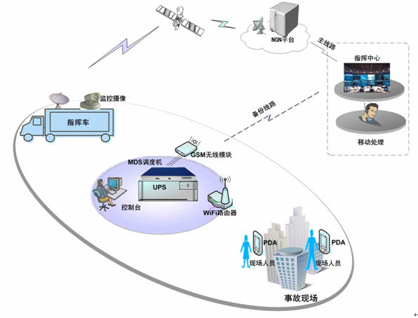 MDS調(diào)度機(jī)通過衛(wèi)星道與政府的NGN平臺對接,實現(xiàn)與整個城市的通信系統(tǒng)對接;并通過GSM、CDMA備份線路,實現(xiàn)多通信通道的實時切換,選擇最好的路由進(jìn)行通信。MDS調(diào)度機(jī)負(fù)責(zé)語音通訊、調(diào)度作業(yè)和指令消息轉(zhuǎn)發(fā);應(yīng)急指揮車配備調(diào)度機(jī)、調(diào)度臺、移動調(diào)度終端、衛(wèi)星接收設(shè)備、監(jiān)控視頻設(shè)備及其他設(shè)備。所有的調(diào)度語音終端都可與MDS調(diào)度系統(tǒng)對接,實現(xiàn)調(diào)度功能及與其他的通信終端進(jìn)行通信。