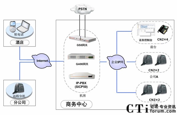 中天凱旋利用企業(yè)內(nèi)部完善的IP通信網(wǎng)絡(luò),在機房部署SICP系統(tǒng),負(fù)責(zé)整個語音通信系統(tǒng)的服務(wù)管理、用戶管理。部署GA90網(wǎng)關(guān)和GS8網(wǎng)關(guān),分別使用E1中繼線路和普通模擬線路接入PSTN網(wǎng)絡(luò),保證系統(tǒng)的通信。