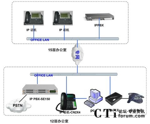 隨著企業(yè)規(guī)模的不斷擴(kuò)展,公司在15層新增約50人的辦公區(qū),需要和12層實(shí)現(xiàn)內(nèi)部通訊免費(fèi)(直撥分機(jī)號碼),出局路由沿用現(xiàn)有ISDN線路。現(xiàn)有的傳統(tǒng)的集團(tuán)電話設(shè)備已經(jīng)滿配,無法適應(yīng)企業(yè)規(guī)模的擴(kuò)張,無法跨地域組網(wǎng),不能建立多點(diǎn)分布式的內(nèi)部電話系統(tǒng),不能充分利用現(xiàn)有的IP網(wǎng)絡(luò)資源發(fā)展有助于提高企業(yè)競爭力的網(wǎng)絡(luò)增值業(yè)務(wù)。