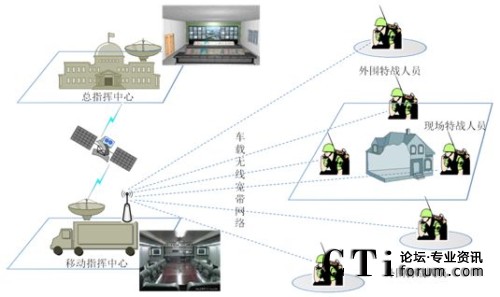 移動(dòng)指揮中心可在執(zhí)行任務(wù)的時(shí)候開往作戰(zhàn)現(xiàn)場(chǎng)附近,車上部署一整套車載調(diào)度平臺(tái),作為現(xiàn)場(chǎng)指揮人員進(jìn)行調(diào)度指揮使用,同時(shí)在指揮車上部署無線寬帶網(wǎng)絡(luò),作為戰(zhàn)場(chǎng)使用,移動(dòng)指揮車和總指揮中心可通過衛(wèi)星網(wǎng)絡(luò)實(shí)現(xiàn)互聯(lián)互通。