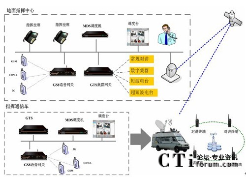 構(gòu)成2:-移動指揮中心(指揮車通信系統(tǒng)):該系統(tǒng)與地面指揮中心一樣部署一整套調(diào)度系統(tǒng)(調(diào)度主機(jī)、調(diào)度臺軟件、中繼網(wǎng)關(guān)、集群網(wǎng)關(guān)、衛(wèi)星接收設(shè)備等),當(dāng)移動指揮車在外工作時,可實現(xiàn)單獨的指揮調(diào)度工作,各不同系統(tǒng)(數(shù)字集群/短波/常規(guī)對講等)的終端人員也可通過調(diào)度機(jī)實現(xiàn)互相通信。