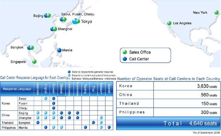 transcosmos的目標(biāo)是通過擴(kuò)大服務(wù)回應(yīng)的語言和持續(xù)強(qiáng)化架構(gòu)提供一站式全球呼叫中心服務(wù)來滿足客戶需要。同時,transcosmos通過全球范圍內(nèi)發(fā)展我們的外呼最佳服務(wù)工具“MO3”,已經(jīng)成功在日本、中國和韓國啟動,也積極地作為客戶的全球IT伙伴支持他們的全球發(fā)展。我們的目標(biāo)是在2011年前海外呼叫中心服務(wù)達(dá)到整個transcosmos集團(tuán)銷售額的10%以及呼叫中心業(yè)務(wù)銷售量的30%。