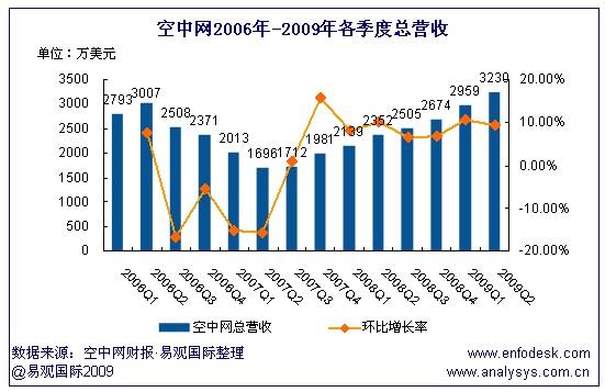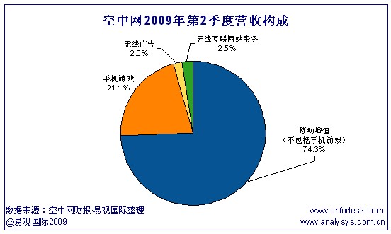 空中網(wǎng)2009年第2季度總營收為3230萬美元,其中總無線增值服務(不包括手機游戲)營收為2393萬美元,同比增長10%,比上一季度增長1%,占總營收的74.09%;手機游戲占總營收的21.05%,比上一季度增長38%;這一季度,空中網(wǎng)將無線廣告和無線互聯(lián)網(wǎng)站服務的收入共同歸為無線互聯(lián)網(wǎng)服務營收,總值為156萬美元,其中41%來自于無線廣告,59%來自于空中網(wǎng)無線互聯(lián)網(wǎng)站服務(包括虛擬物品銷售以及手機游戲和無線增值服務的交叉銷售)。易觀國際(Analysys