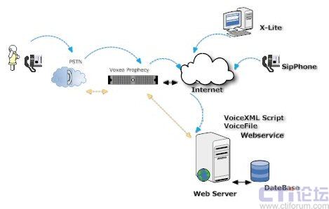 用戶首先通過固定電話或者手機(jī)傳統(tǒng)方式向Prophecy 提出請求,Prophecy我們可以理解為Voice Browser,使用者可以存取Internet