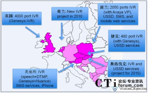 WEB和語音等渠道的整合;第二,為客戶提供簡單直觀的自助服務選項;第三,便捷部署業(yè)務,快速分析客戶行為,調(diào)整業(yè)務方式。VoiceObjects成功克服這三個挑戰(zhàn),在歐洲T-Mobile贏得多個國家的份額,并且有不斷增長的趨勢。
