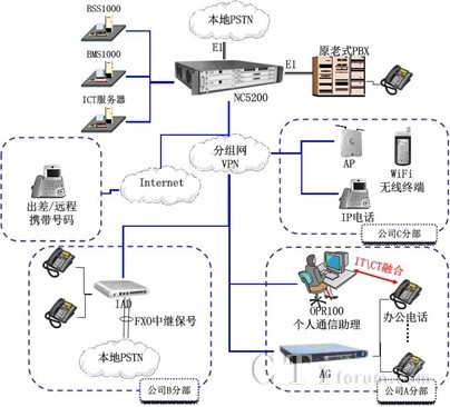 整個系統(tǒng)內(nèi)部通過主流標準協(xié)議聯(lián)結,支持與運營商IMS網(wǎng)絡的無縫對接。新增分支機構只需增加NC5200系列IP-PBX或者IAD即可融入公司整個通信系統(tǒng)。