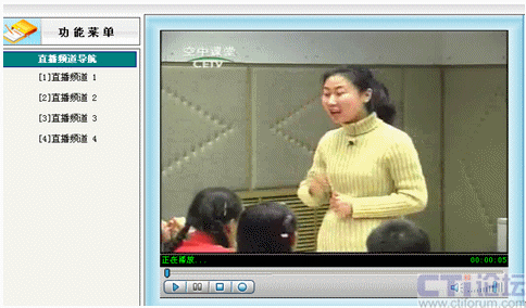 先在直播系統(tǒng)里啟動(dòng)設(shè)置好的01號(hào)頻道,其他教師就可以在各自辦公室通過(guò)計(jì)算機(jī)網(wǎng)絡(luò)觀看遠(yuǎn)教節(jié)目,不需淘神費(fèi)力地到專(zhuān)門(mén)的接收室了。如下圖: