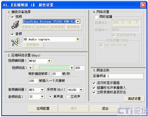 用鼠標(biāo)右鍵點(diǎn)擊直播頻道管理下的某個(gè)頻道號(hào),我這里選擇01:在彈出的右鍵菜單中選擇“直播頻道設(shè)置”或者點(diǎn)擊工具欄里的“頻道設(shè)置”圖標(biāo),出現(xiàn)下面的設(shè)置圖: