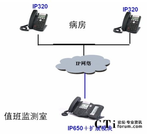 SoundPoint IP320。監(jiān)控室的值班醫(yī)生需要和患者溝通時,只需按IP650上病房相應(yīng)的快速撥號鍵,一鍵快速的呼叫病房的IP320。病房的患者也可以摘機(jī)或按免提鍵自動呼叫監(jiān)測室的IP650,和值班醫(yī)生進(jìn)行溝通。當(dāng)值班醫(yī)生和患者通話時,其它患者的電話呼叫監(jiān)測室,值班醫(yī)生可以看到是哪個病房呼叫的,可以馬上接聽,也可以結(jié)束當(dāng)前通話后根據(jù)通話記錄回呼患者進(jìn)行溝通。