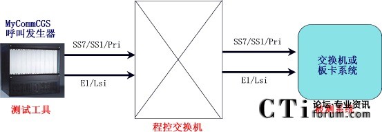 交換方案將MyCommCGS呼叫發(fā)生器和被測系統(tǒng)都通過同樣的電纜和信令方式連接到公網(wǎng)的程控交換機(jī)上,由呼叫發(fā)生器模擬公網(wǎng)用戶通過程控交換機(jī)向被測系統(tǒng)發(fā)起呼叫。