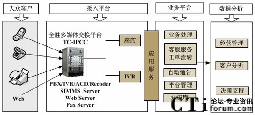 隨著呼叫中心技術(shù)的發(fā)展,傳統(tǒng)的語音通話已不能滿足日益增長的業(yè)務(wù)需求,TC-IPCC平臺整合了視頻Video、文本Text、電子郵件Email、短消息SMS、互聯(lián)網(wǎng)Web以及3G等多媒體通訊方式。高效、統(tǒng)一的把各種媒體渠道融合在一起,并極大地拓展了聯(lián)絡(luò)中心業(yè)務(wù)應(yīng)用的類型和范圍。
