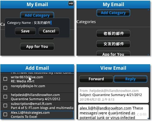 及時、安全的郵件收發(fā)是黑莓手機(jī)用戶鐘愛黑莓的重要原因之一。然而,當(dāng)成千上百封郵件堆積在郵件系統(tǒng)內(nèi),疏于整理和歸類,以至于你無法找到或者挑選你想要的那封郵件中的信息時,你可能就沒那么Happy了吧?My Email應(yīng)用,可以稱之為你郵件系統(tǒng)的“管家婆”,安裝了它之后,你可以將所有郵件有條理的進(jìn)行分類管理:公私分明、客戶分明、項(xiàng)目分明、老板同事分明,想瀏覽哪類郵件一目了然。此外,對于那些及其重要的郵件,“管家婆”還可以幫你儲存在SD卡上,即使原郵件已經(jīng)被刪除,儲存的郵件也可以被找回,如此一來,有限的手機(jī)存儲空間中就不必再存儲大量無關(guān)緊要的各種郵件,騰點(diǎn)空間給你心水的各種音樂圖片和視頻吧。