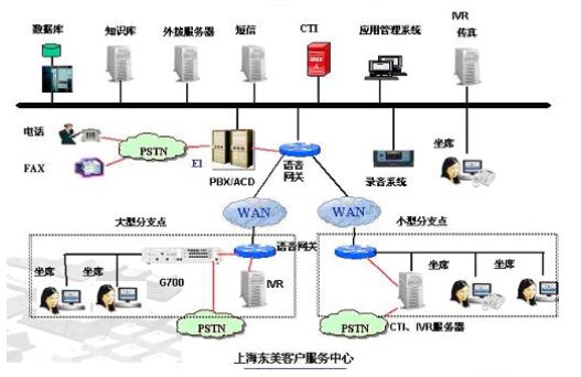 中心點和分支點的客服系統(tǒng)通過兩地的語音網(wǎng)關(guān)進行語音連接,具體實現(xiàn)大概是,如果分支點需要把語音轉(zhuǎn)接到中心點,分支點把TDM語音轉(zhuǎn)接到語音網(wǎng)關(guān),語音網(wǎng)關(guān)把TDM語音信號轉(zhuǎn)變?yōu)镮P包,通過網(wǎng)絡(luò)發(fā)送到中心點的語音網(wǎng)關(guān)上,語音網(wǎng)關(guān)把IP包變?yōu)門DM語音信號,在接入到交換機上,由中心點CTI按照指定的策略轉(zhuǎn)接到最終目標上。