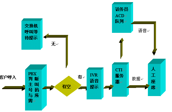 Server,CTI Server控制PBX執(zhí)行轉(zhuǎn)接任務(wù),呼叫進(jìn)入人工座席ACD隊(duì)列排隊(duì),如相關(guān)話(huà)務(wù)員有空閑,則執(zhí)行轉(zhuǎn)接操作。同時(shí)對(duì)于有些服務(wù),根據(jù)需要,CTI