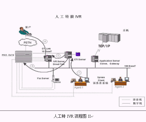 典型的客戶(hù)電話(huà)從人工服務(wù)轉(zhuǎn)接IVR的物理流程如下: