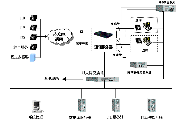 。1).110、119、122報警電話的傳送與集中接聽模式:所有轄區(qū)以內(nèi)的110、119、122報警電話都經(jīng)市電信局統(tǒng)一匯接,通過一條PCM2MBPS數(shù)字中繼送往市局指揮中心hxd09可編程智能語音交換機(jī)(簡稱交換機(jī),下同)。再由交換機(jī)經(jīng)過數(shù)模轉(zhuǎn)換、排隊分配等處理后送往指揮中心各受理臺。此外,系統(tǒng)還備用了4條專用的模擬中繼線,用于當(dāng)PCM數(shù)字鏈路發(fā)生意外時,作為傳送110、119、122報警電話的應(yīng)急備用專線。