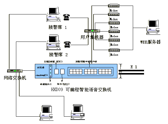 綜合接警平臺主要由hxd09可編程智能語音交換機(jī)和計算機(jī)網(wǎng)絡(luò)兩部分組成,交換機(jī)負(fù)責(zé)110、119、122報警電話的接入與分流及調(diào)度呼出等功能;計算機(jī)網(wǎng)絡(luò)則完成110、119、122報警信息的顯示、數(shù)據(jù)儲存、統(tǒng)計及信息查詢、發(fā)布功能。