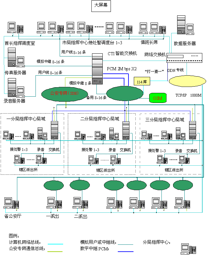 - 樹立大網(wǎng)絡(luò)概念:采用先進(jìn)的通訊、計算機(jī)網(wǎng)絡(luò)技術(shù)(采用CTI可編程交換技術(shù)),利用現(xiàn)有的通信資源,實現(xiàn)市局指揮中心與消防大隊、交警大隊、各派出所的計算機(jī)網(wǎng)絡(luò)及相關(guān)領(lǐng)導(dǎo)辦公室計算機(jī)大聯(lián)網(wǎng);形成全市范圍內(nèi)110、119、122有線、無線全方位立體調(diào)度語音通道大網(wǎng)。