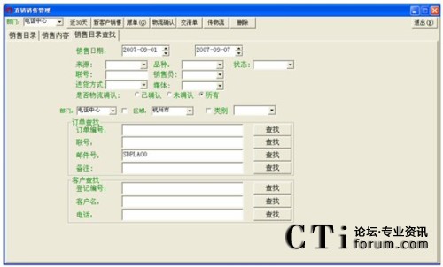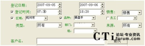 例子:查找2007年9月5日到2007年9月6日間,登記時間為早上7:30到晚上18:20,購買了操盤手軟件的杭州市顧客的查找設置如下: