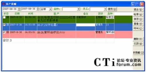 對于已經(jīng)回訪過的提醒,選定它并單擊已回,這樣它的狀態(tài)就會標記為已回,再單擊一下查找,則剛才設定為已回的提醒,記錄的顏色變?yōu)榉奂t。