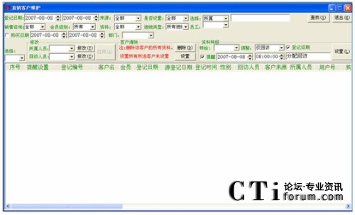 注:對于登記日期一直到客戶名這一段條件的查詢(即上圖中所有的那些查詢條件),都得點擊客戶名欄對應的那個查找按鈕才能進行有效的查找,否則若點擊其它按鈕(姓名電話直接檢索對應的查找除外),都會提示“請輸入****”這種錯誤信息。而點擊最后一個查找,也是無效的,會轉到客戶管理中空白信息欄(即什么也查不到)。