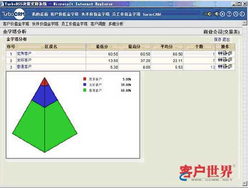 根據(jù)預(yù)先設(shè)定的客戶價(jià)值評(píng)估模型,CRM會(huì)自動(dòng)計(jì)算出每個(gè)客戶的價(jià)值得分以及對(duì)應(yīng)到不同等級(jí)的客戶價(jià)值,并會(huì)記錄到客戶項(xiàng)下,便于業(yè)務(wù)人員在與客戶接觸時(shí),直觀了解客戶價(jià)值情況?蛻魞r(jià)值金字塔分析(如圖),可以動(dòng)態(tài)的了解各類客戶的價(jià)值分布。
