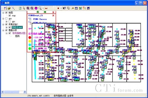地圖可以顯示信道、指定的AP、指定網(wǎng)絡(luò)的信號(hào)強(qiáng)度、噪聲、干擾強(qiáng)度、丟包率等點(diǎn)圖,并通過圖例和不同顏色顯示在地圖上,用戶通過點(diǎn)圖可以很直觀的發(fā)現(xiàn)某個(gè)區(qū)域存在弱覆蓋、丟包率過高、同頻干擾、鄰頻干擾等網(wǎng)絡(luò)問題。