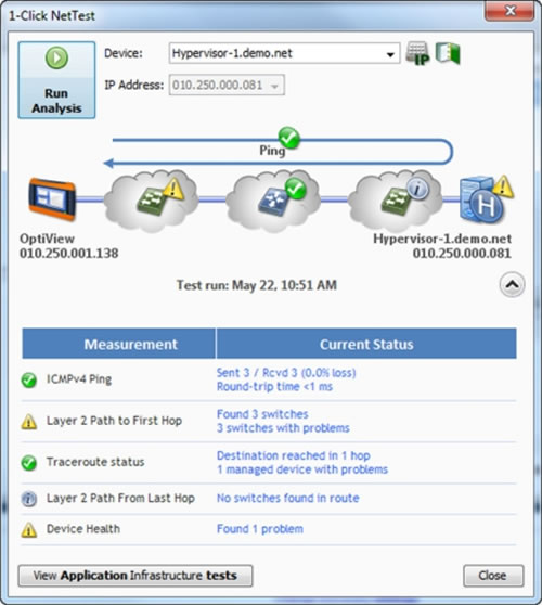OptiView XG v8 具備兩種新的故障排除功能:一鍵 NetTest 和自動多段分析,能夠迅速確定數(shù)據(jù)路徑以及隔離出物理和虛擬網絡中的問題。只需按一下按鍵,一鍵 NetTest 就能找出單個屏幕視圖里的連接路徑。