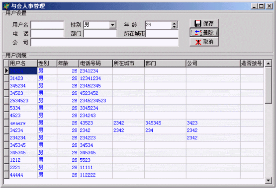 只有會(huì)議組建立后,需要為會(huì)議組選擇需要參加的用戶電話,即分公司電話,以便系統(tǒng)確定會(huì)議參加人員,管理員選擇人事管理后,用戶管理如下圖: