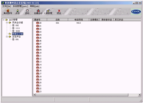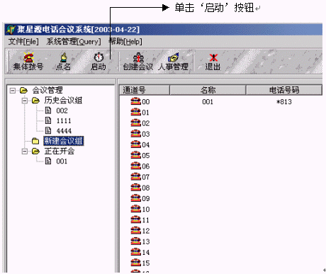 3、系統(tǒng)上方是工具欄,包括:創(chuàng)建會(huì)議、人事管理、啟動(dòng)、集體撥號(hào)、雙工/單工、點(diǎn)名、電話薄等快捷鍵。